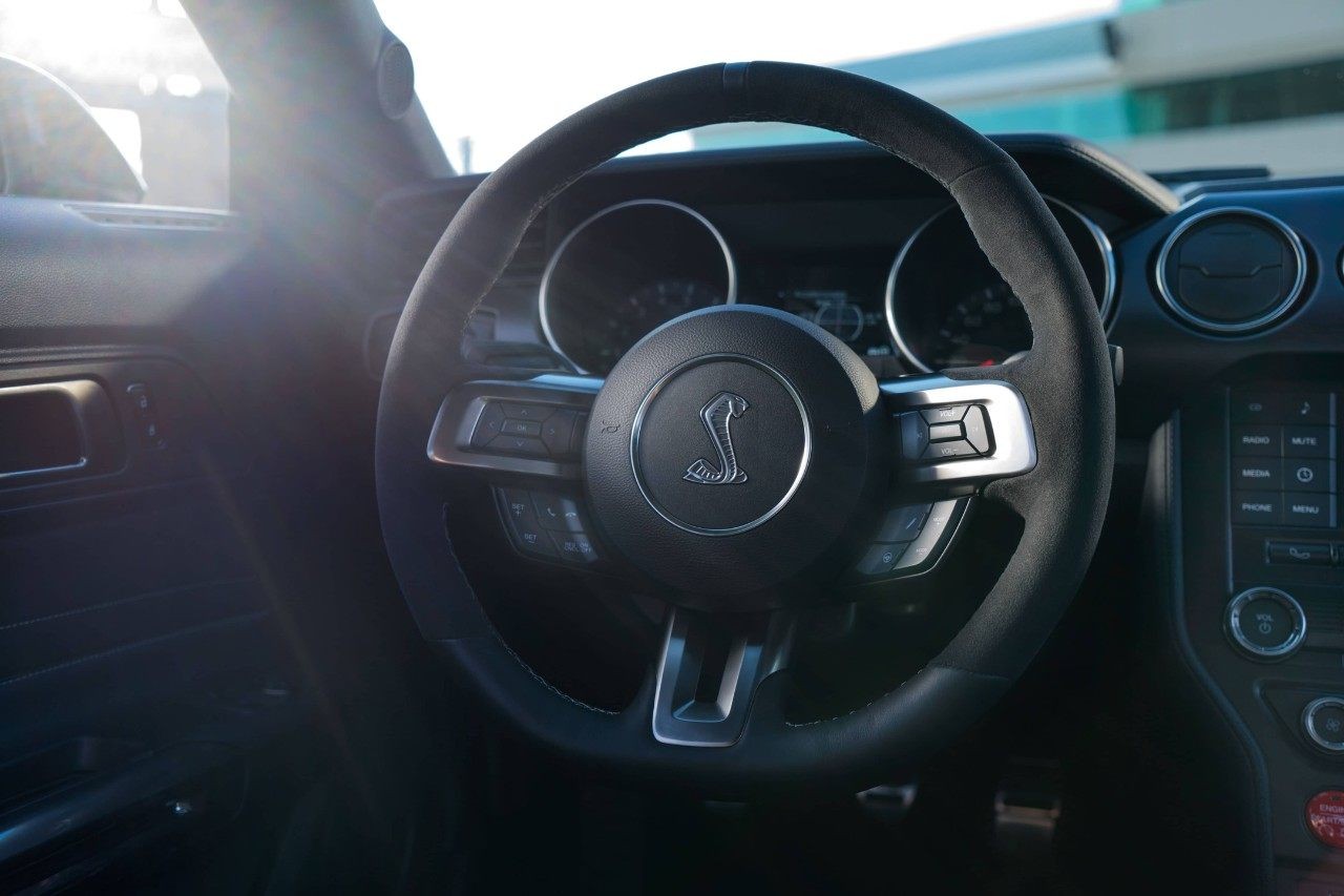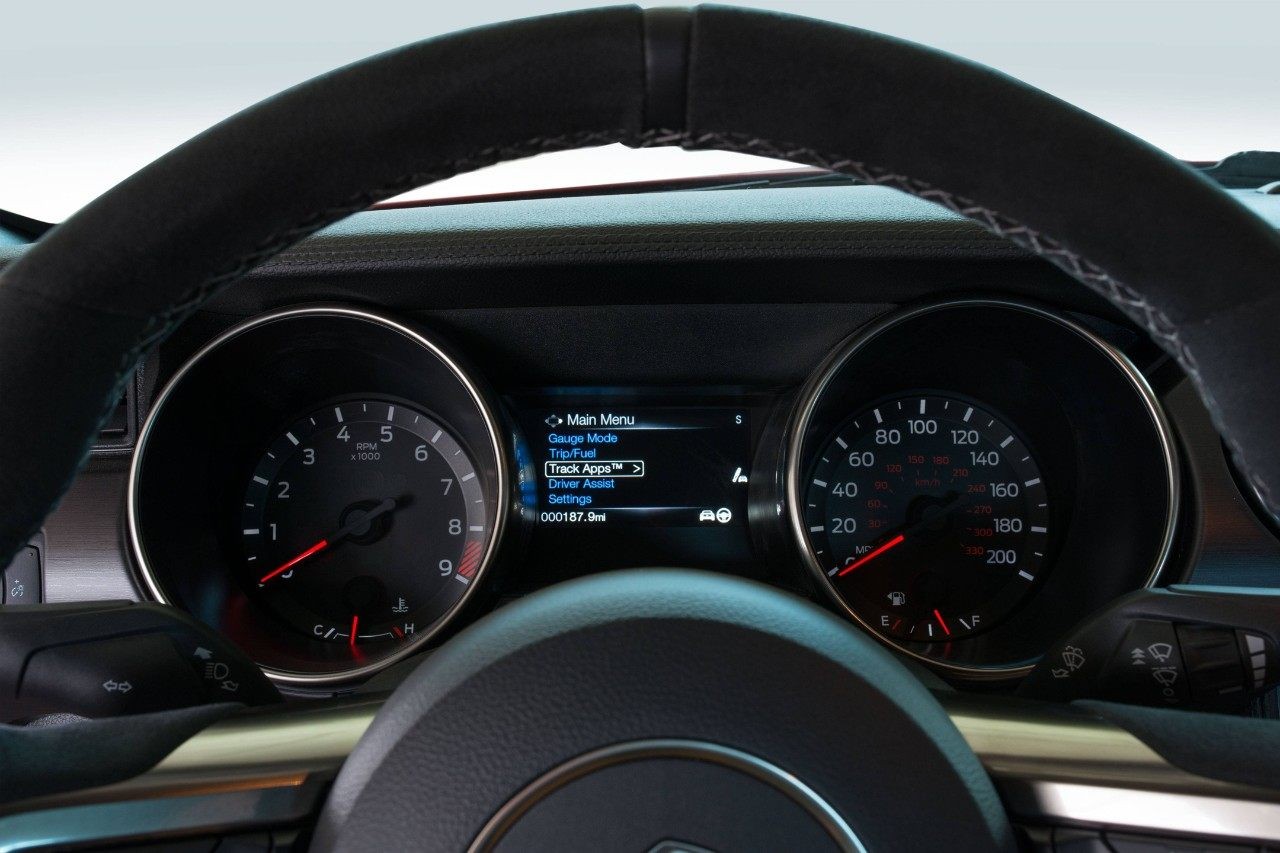 With the engine off, the Cobra definitely has a retro feel to it. Once you push the start button, the technology reveals itself. Dual climate control. The popular Sync3 touchscreen system and navigation, a six-speaker audio system, rearview camera, and message center in the instrument cluster come to life.