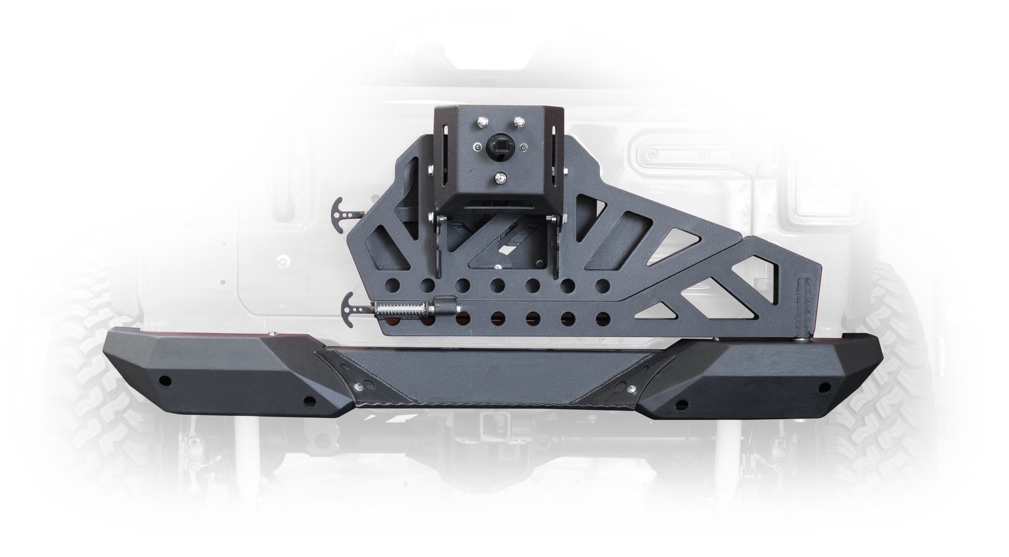 DV8 Off Road Frame Mounted Tire Carrier with Bumper was designed for the hardcore offroader who needs to know that their spare isn't going anywhere. The first of its kind, it's installed by bolting the tire carrier directly to the frame, then bolting the end caps to the tire carrier. This provides unparalleled rigidity and makes the mounting rock solid. Not only that but the caps can be changed out for different styles should you choose to change up the look of the bumper. The tire carrier also has a pivoting function that allows for the user to drop a large spare tire without needing help. The carrier drops the spare all the way to the ground to save you from the back-breaking task of trying to wrestle it off of the tire carrier.