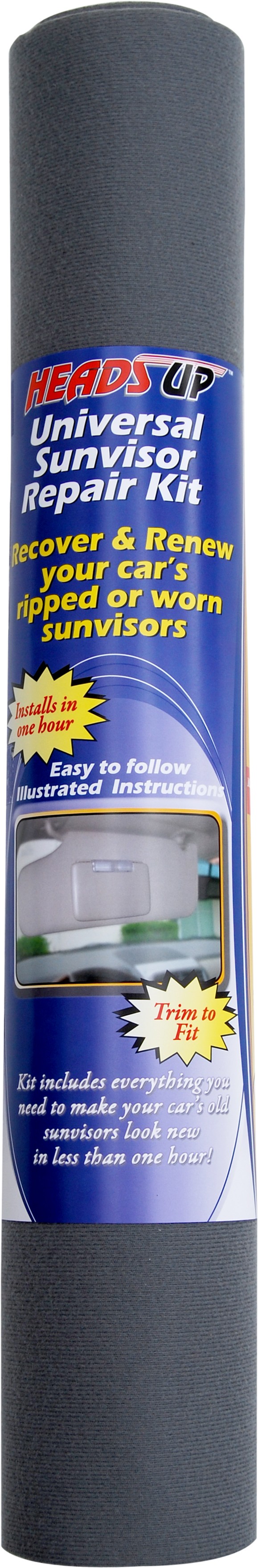 The Light Grey Standard Sun Visor Repair Kit includes everything you need to recover your vehicle's existing old, worn, torn, and stained sun visors. This repair kit installs easily with common household tools and requires no sewing. The illustrated instructions walk you through recovering any sun visor, regardless of shape, size and attached accessories, such as mirrors and/or lights. The Sun Visor Repair Kit includes: 1 Roll foam backed sun visor fabric (enough material to complete (2) two sun visors), 2 oz visor grip adhesive, 1 Roll clear PVC template / Backing material , step by step, detailed,?illustrated instructions, as well as Customer Support Helpline. A perfect addition when used with a Heads Up matching Headliner Replacement Kit.