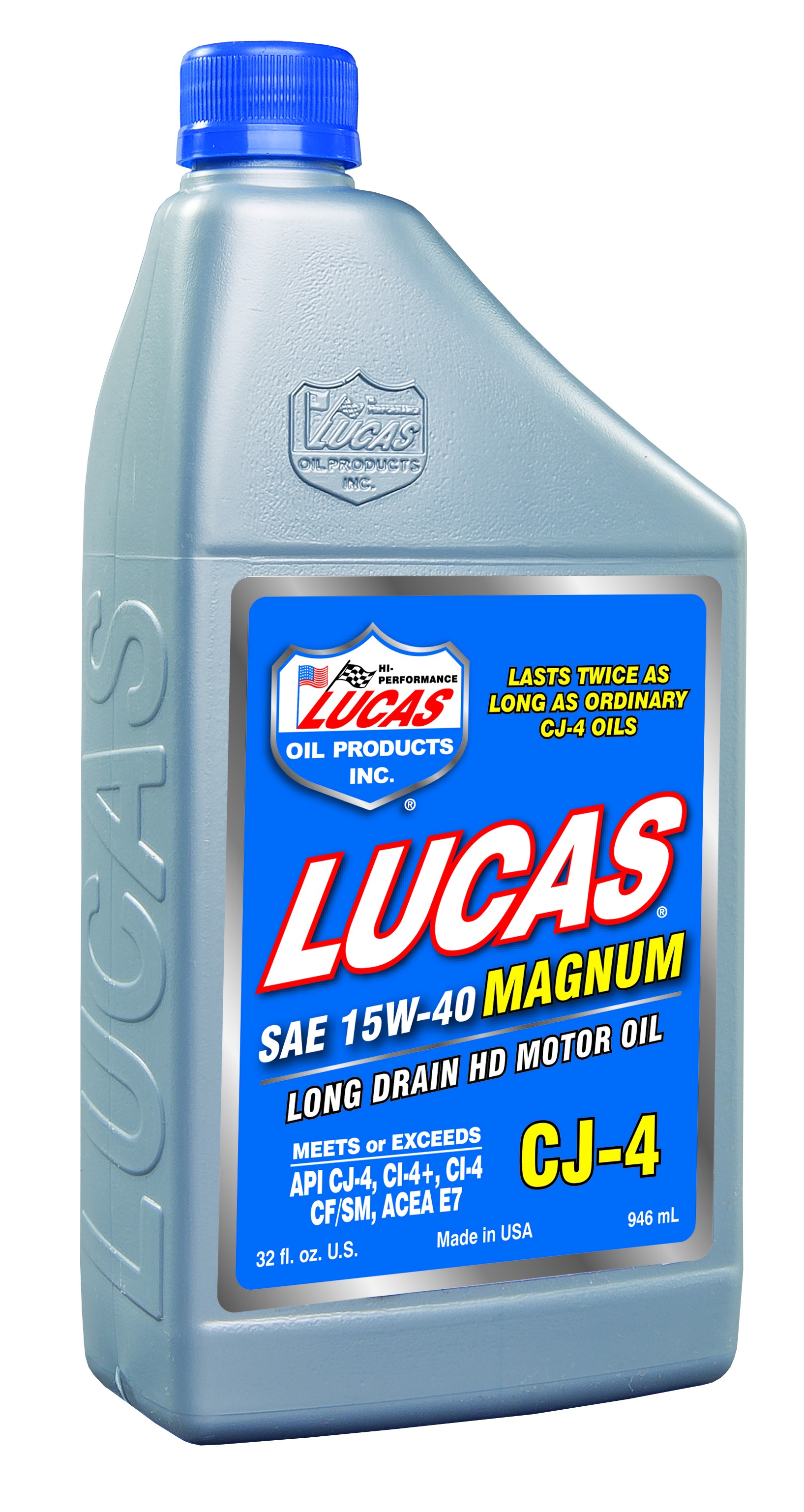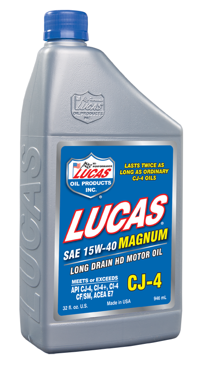 Lucas Oil SAE 15W-40 Magnum CJ-4 Long Drain Truck Oil is blended with premium base oils and ?Lucas? additives that help maintain the life of the emission control system as required for regulatory compliance. You can expect less oil consumption and reduced engine wear. It resists oxidation and thermal breakdown for total protection in new and older engines. Provides increased lubricity, lowers oil temperature, reduces engine noise, increases oil pressure, and reduces soot levels. Suitable for use in gasoline and diesel powered engines. Lucas Oil SAE 15W-40 Magnum CJ-4 Long Drain Truck Oil is backward compatible with all old and new engines using Ultra Low Sulfur Diesel. Lucas Oil CJ-4 is compatible with all after treatment devices and keeps EGR engines clean. Recommended for use in all 2007 compliant engines specifiying CJ-4/CI-4 Plus/CI-4/CH-4/CG-4/CF-4/SM & European and OEM claims. Meets or exceeds Mack EO-O Premium Plus ?07, Cummins CES 20081, Caterpillar ECF-3 & ECF1, DCC PG0S 93 K218,Volvo VDS-4, Navistar DHD-1, JASO DH-2, ACEA E7, and MAN 3275.