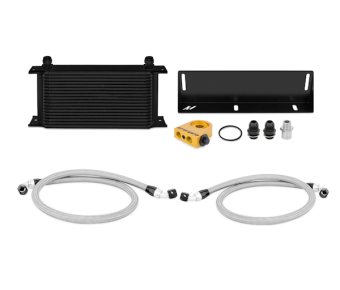 The Fox Body Mustang is well known for its lightweight chassis and powerful drive train.High-powered NA, turbocharged, and supercharged vehicles produce an abundance of unwanted heat under the hood, which accelerates oil breakdown and engine wear.Protect and enhance your Mustang with the Mishimoto direct-fit oil cooler kit.This kit features a large 19-row oil cooler that mounts in the front bumper for maximum airflow and cooling efficiency.The Mishimoto Mustang oil cooler kit can be installed in less than two hours and adds more than .5 qt to your total oil capacity.This kit includes a mounting bracket engineered specifically for the Fox Body, preassembled lines, fittings, oil sandwich plate, and all hardware necessary for a clean installation.The Mishimoto oil cooler kit is available with a thermostatic sandwich plate for additional oil temperature control, and your choice of stealth black or silver cooler.As with all our products, this kit includes the Mishimoto lifetime warranty.
