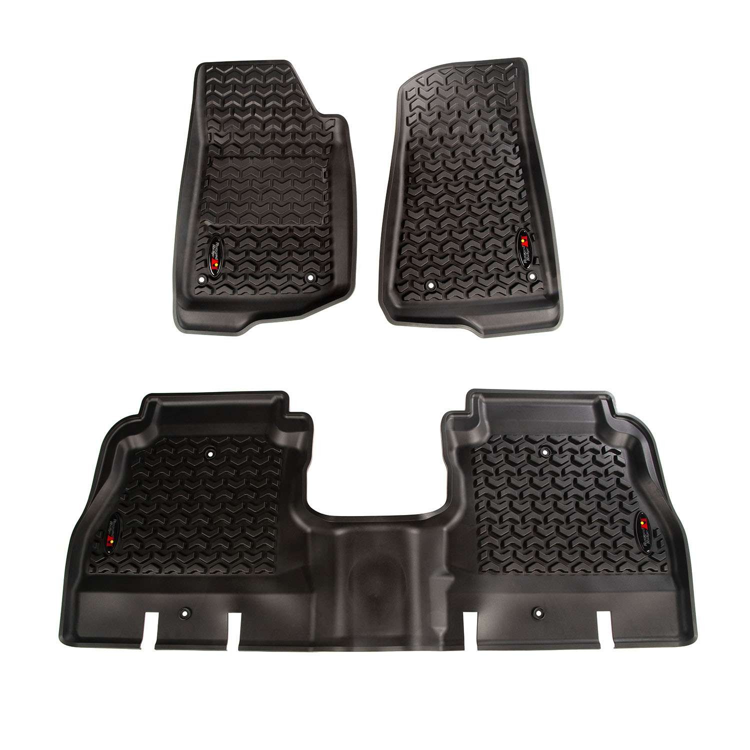 Need an affordable solution to keep the cabin floors of your Jeep looking factory fresh? Try Rugged Ridge's All Terrain Floor Liners! Made of a durable OE-quality thermoplastic material that can withstand the rigor of daily abuse, each liner is perfectly contoured to your vehicle's floor for precise secure fitment (floor hook attachment where applicable). The raised lip captures all spills, water and debris keeping your interior pristine. Features a chevron shape patented deep tread technology. Patent 8,173,369, D627,285