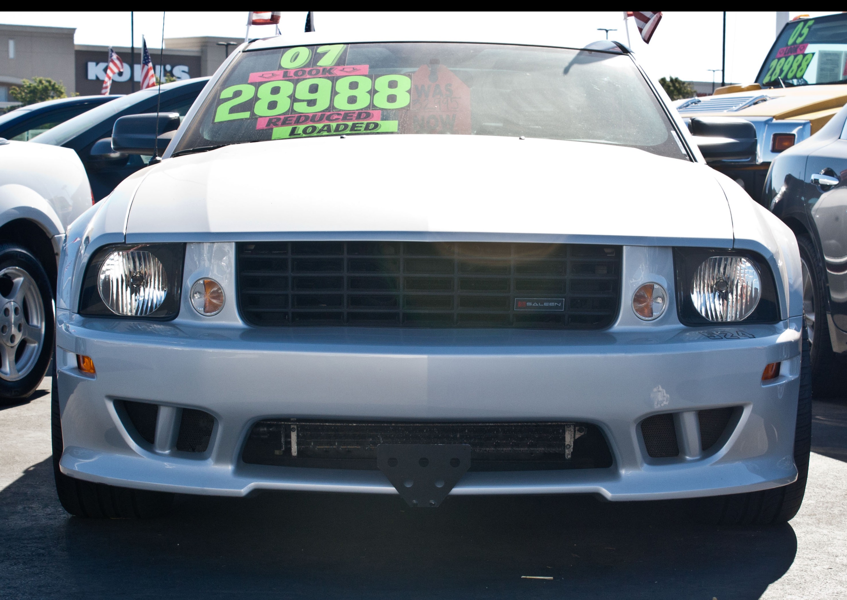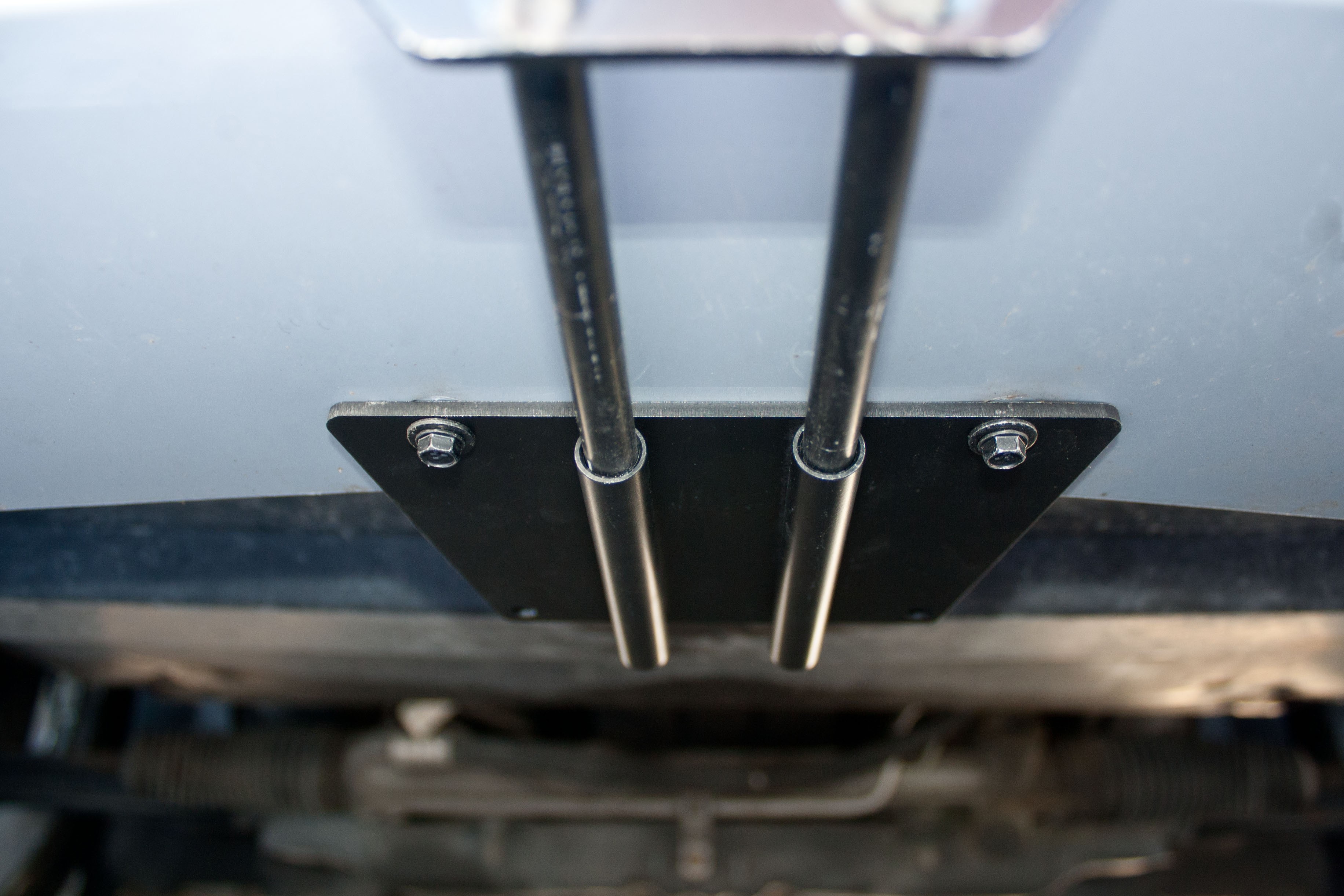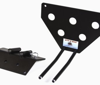 This bracket fits the 2005-2009 Mustang Saleen. Constructed of 5052 and 6061 aluminum, welded and anodized black, this bracket is built to last. Comes with a limited life time warranty. All parts required for installation included, however, tools are required. Requires 2 holes to be drilled underneath vehicle on the underside of the spoiler. These holes are not visible and will not detract from the look of the vehicle. NOTE: The factory under body deflector panel must be in place to install bracket. Ford part # 5R3Z17626BA Made in USA.